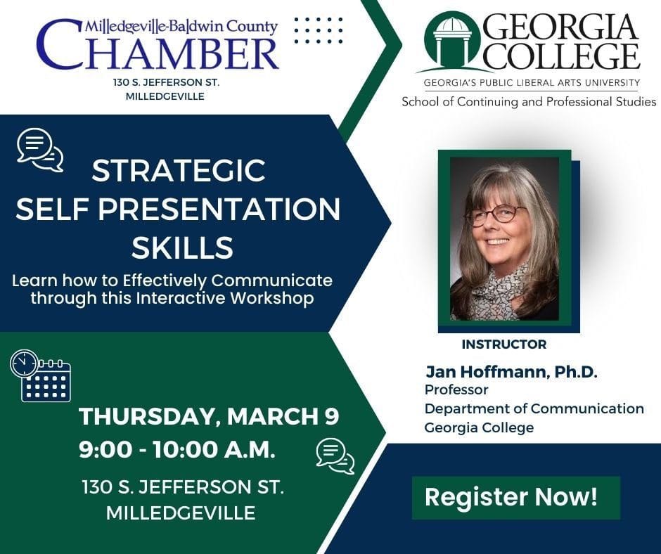 Please join the Milledgeville-Baldwin Chamber on at 9 am on Thursday, March 9 for their first business workshop of the year! Dr. Jan Hoffman, Professor in the Georgia College, Dept. of Communication, will be teaching an interactive workshop on how to effectively communicate. This is a FREE event for Chamber members through the Chamber's partnership with Georgia College, School of Continuing and Professional Studies.
