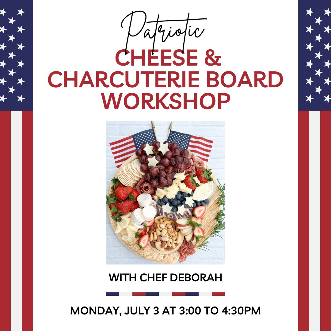 Join Chef Deborah's 90-minute Charcuterie Workshop to learn how to create a stunning Cheese & Charcuterie board. Discover food styling techniques as you combine an array of meats, cheeses, seasonal delicacies, fresh fruit, nuts, crackers, and chips for a patriotic-themed culinary creation. BYOWine and leave ready to impress at your next gathering.