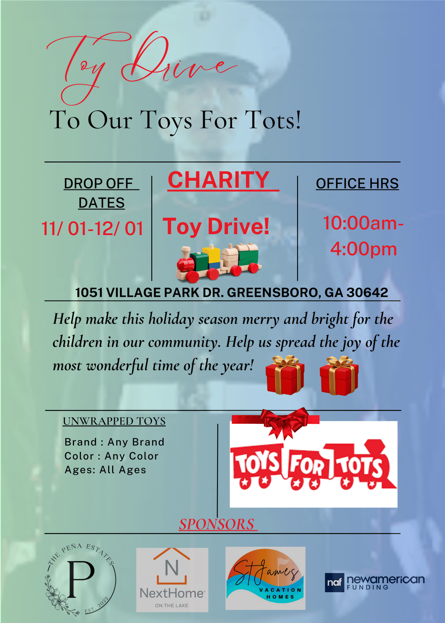 The drive will run from November 1st to December 1st, and they are accepting donations of unwrapped toys of all colors and sizes.