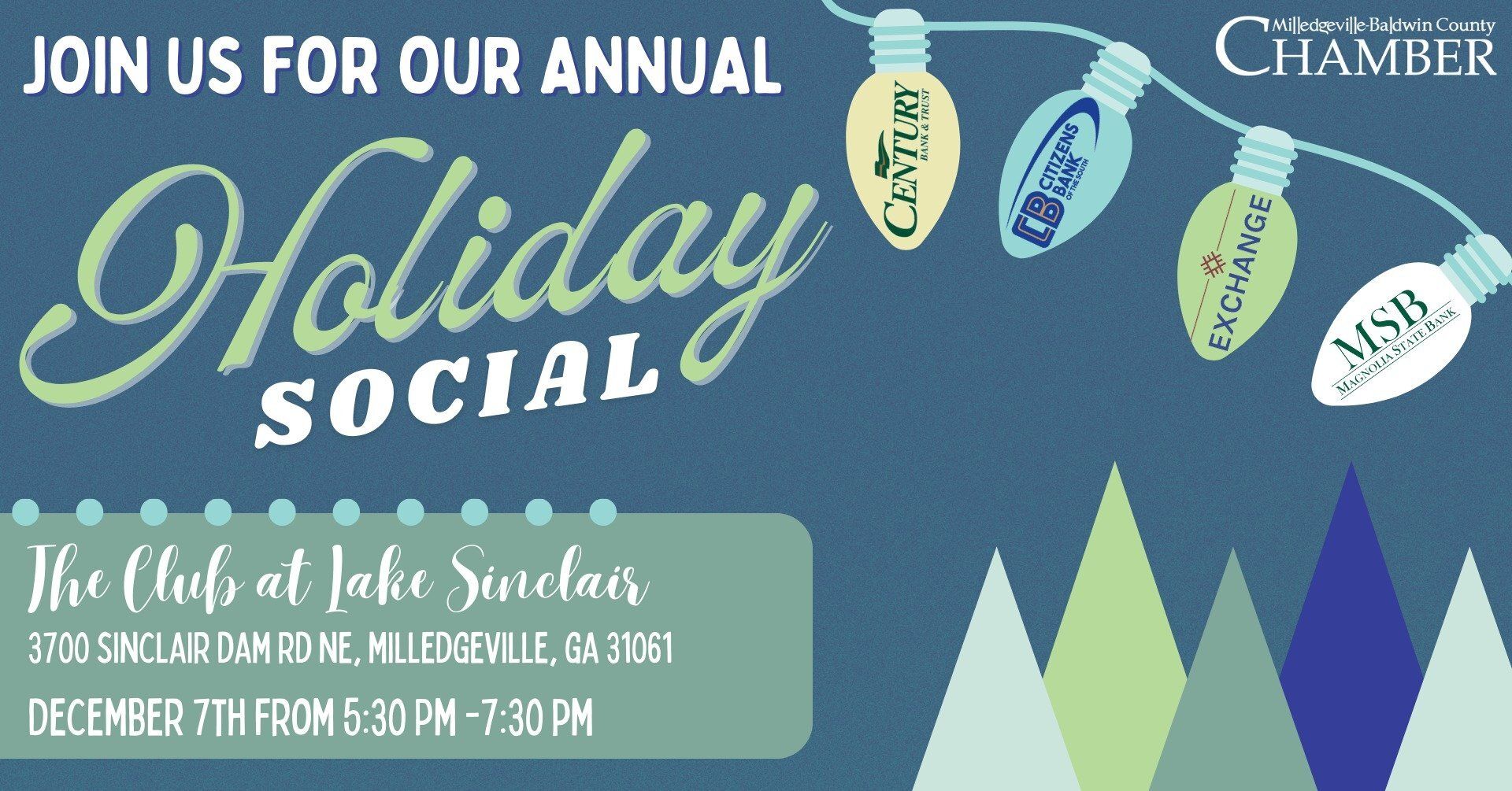 The Holidays are in full swing, and it is time for The MBC Chamber to celebrate. They are excited to announce that the holiday season will kick off with a Holiday Social, sponsored by Century Bank and Trust, Citizens Bank of the South - Milledgeville, Exchange Bank, and Magnolia State Bank.