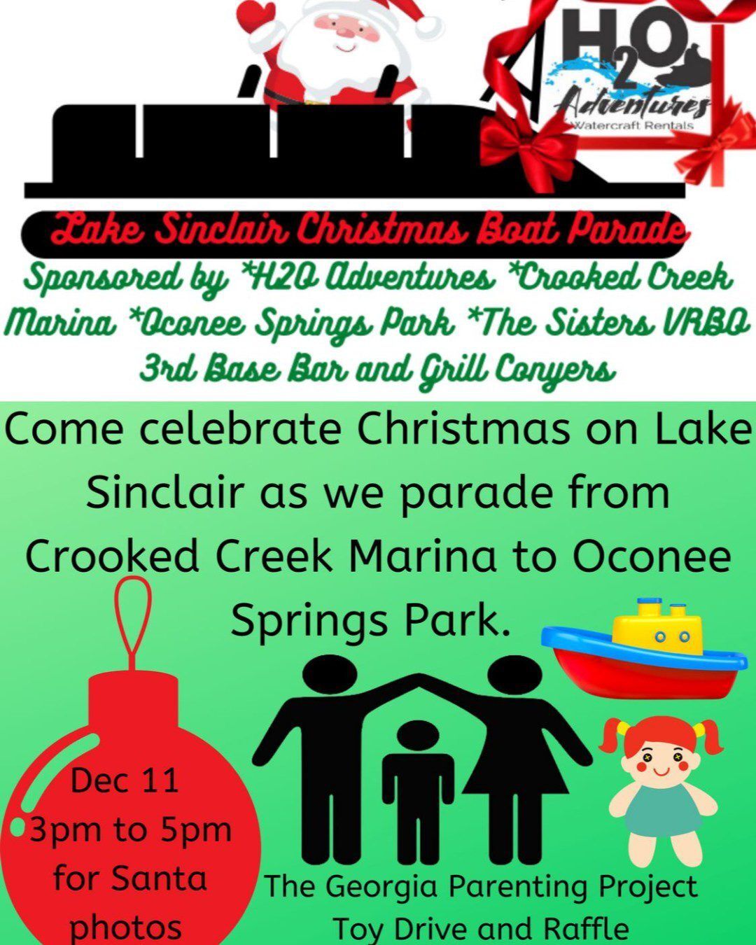 Mark your calendar for the Lake Sinclair Christmas Boat Parade sponsored by H2O Adventures Rentals, Oconee Springs Park and many others!
