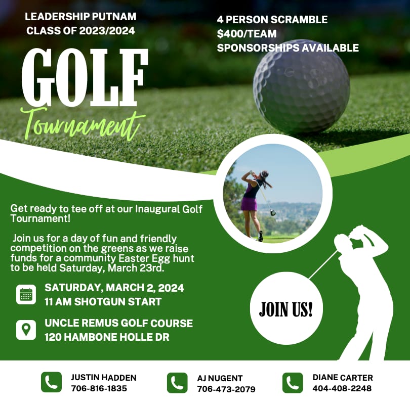Come out and join the Leadership Putnam Class of 23/24's first-ever golf tournament on Saturday, March 2nd at 11:00am at Uncle Remus Golf Course. Registration starts at 10:00am.