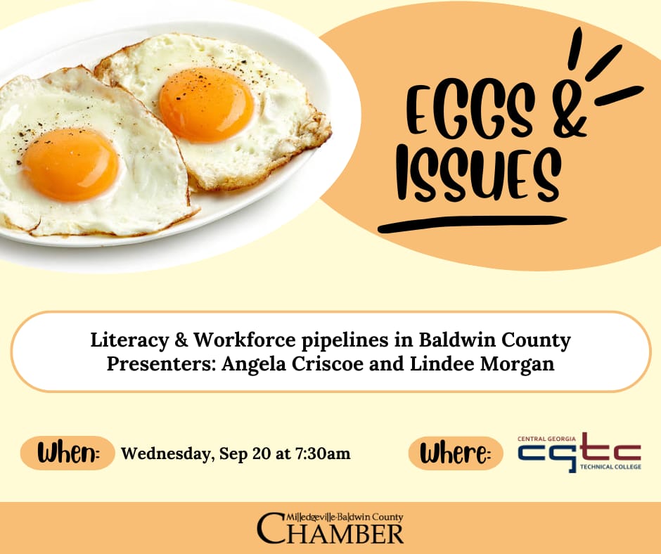 The topic is Literacy and Workforce Pipelines in Baldwin County, and it will be presented by Angela Criscoe, Executive Director, School of Continuing and Professional Studies and Lindee Morgan, Executive Director of the Sandra Dunagan Deal Center for Early Language and Literacy.