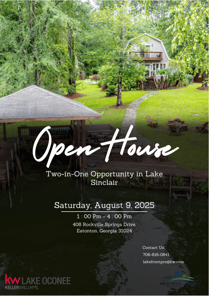 Saturday, August 9 | 1–4 PMSwing by 408 Rockville Springs Drive to tour a rare Lake Sinclair gem — complete with guest quarters, a sunroom, hot tub deck, fire pit, and its own boathouse. Bonus: $10,000 in closing cost assistance!