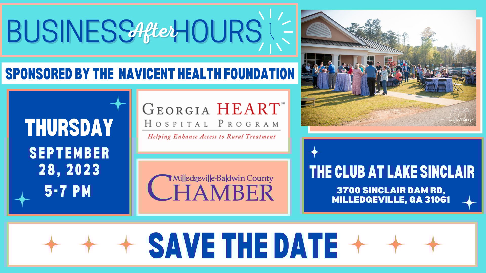 Join The Chamber at The Club at Lake Sinclair on September 28th from 5-7 pm for a Business After Hours sponsored by the Navicent Health Foundation and the Georgia Heart Program.